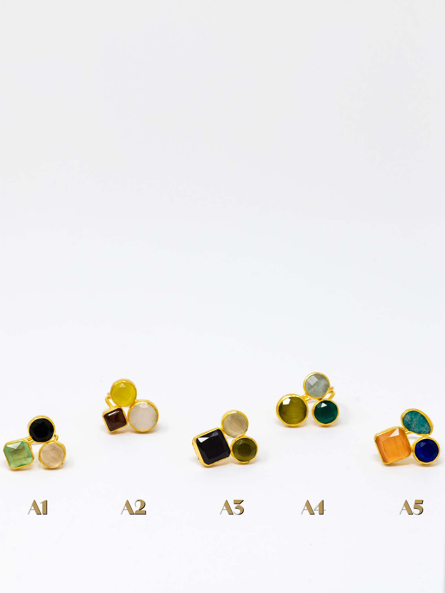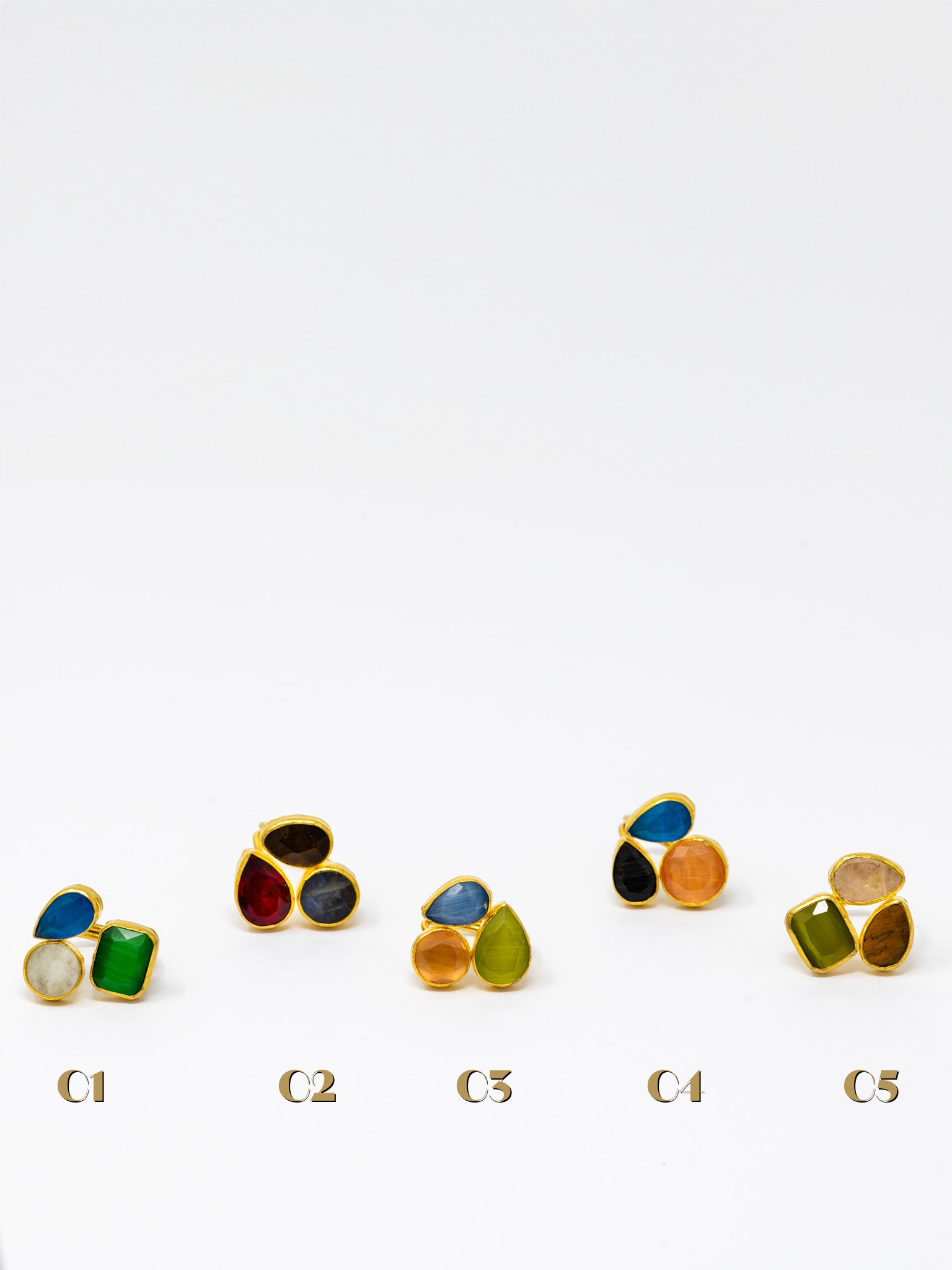 Anello in ottone placcato oro 22 Kt con tre pietre naturali, realizzati a mano in pezzi unici e irripetibili.