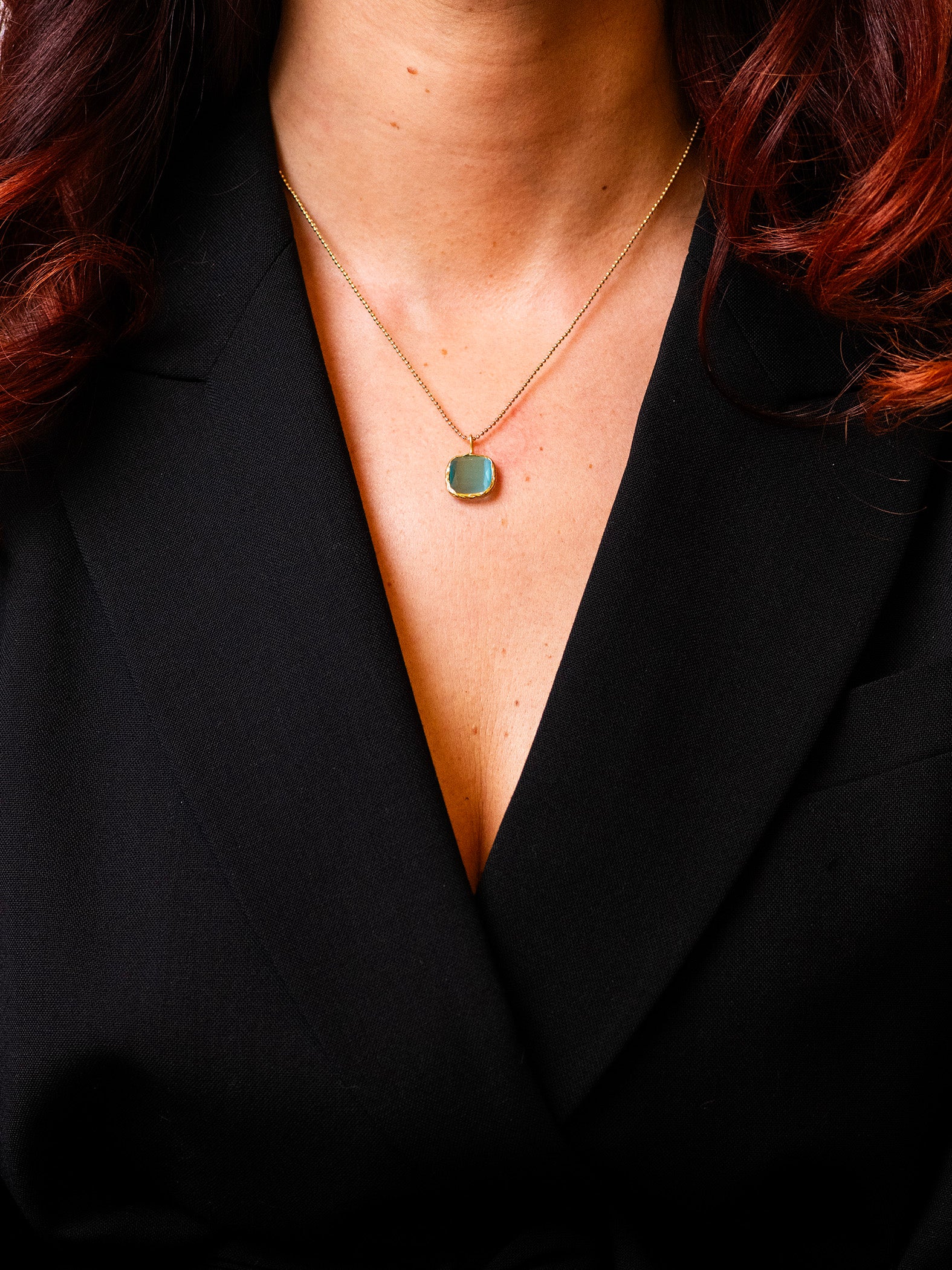 Le collane Myra, realizzate a mano in ottone placcato oro 22 carati, si distinguono per un ciondolo con pietra naturale, disponibile nelle forme tondo, quadrato e goccia. Ogni dettaglio è studiato per esaltare la luce e l’eleganza della pietra, creando un equilibrio perfetto tra raffinatezza e stile.
